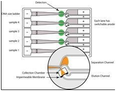 運行中,軟件通過實時光路檢測,和參考泳道中的DNA ladder進行比對,確定已經(jīng)設置回收長度范圍的DNA片段到達洗提泳道(elution channel)的準確時間