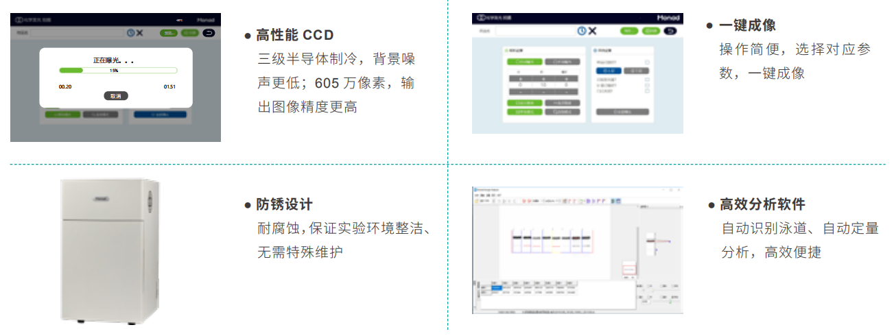 Quickchemi 5200化學(xué)發(fā)光成像系統(tǒng)適用于ECL發(fā)光直接成像,采用三級深度制冷CCD作為感光芯片,最大程度降低暗電流,提高信噪比。像素值高達(dá)605萬,并具有極高感光效率,結(jié)合F0.95大光圈鏡頭,收集微弱信號能力更強,成像效果更好,速度更快,且線性范圍更寬。特殊設(shè)計的防銹機身,簡單大方耐腐蝕;外接 24 寸大屏顯示器,強大的拍攝及分析軟件,操作簡單便捷,拍攝不同信號強度樣品時,能自動匹配拍攝參數(shù),實現(xiàn)“一鍵成像”。