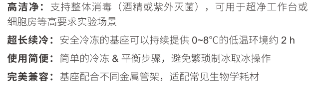 恒溫金屬冰盒,由底部基座和上部金屬管架兩部分組成,完全冷凍的基座可持續(xù)提供0~8℃低溫環(huán)境約2小時,確保加樣過程中樣品和試劑的活性,有效提高實驗可靠性和工作效率?;闹黧w為鋁材,內(nèi)部填充環(huán)保水基變相材料,外層硅膠套具有保護基座與保溫雙重效果?;鶐в袦囟扔?,具有溫度指示功能,當(dāng)溫度計指針指示在0℃左右時,表明基座進入溫度穩(wěn)定期。此外,恒溫金屬冰盒配套有毛巾,方便吸附冷凝水。