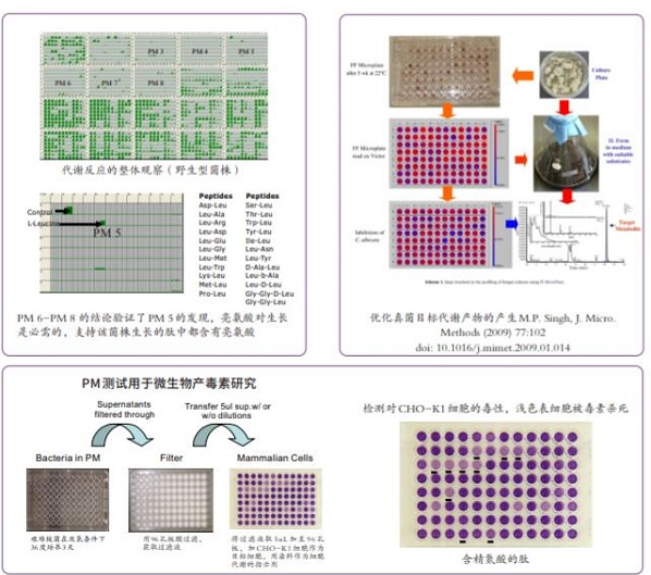 優(yōu)化二級代謝產(chǎn)物生成條件:如抗生素,細(xì)菌、真菌毒素的產(chǎn)生,將PM技術(shù)與抑菌圈法、色譜法,直觀顏色判斷法或活細(xì)胞測試等相結(jié)合,通過快速確定培養(yǎng)后PM板每個(gè)微孔中的苗液是否含有相應(yīng)的刺激代謝產(chǎn)物。