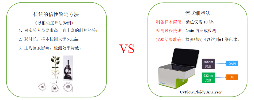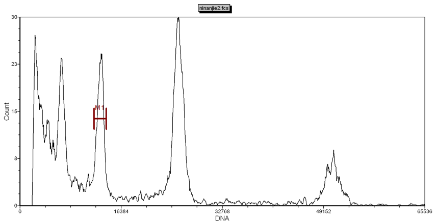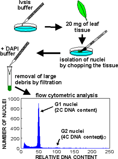 傳統(tǒng)的倍性鑒定主要采用常規(guī)壓片法統(tǒng)計染色體數(shù)目,但采用這種方法很難尋找到分裂中期染色體分散良好并可進行計數(shù)的細胞,而且整個過程耗時長,檢測效率低。采用流式細胞術(shù)(Flow Cytometry,F(xiàn)CM)進行倍性分析的方法簡化了倍性分析的過程,可以快速準確檢測同一物種范圍內(nèi)不同倍性的樣品。FCM作為一項快速、高效的檢測技術(shù),被廣泛應用于細胞分類學、植物遺傳學及植物生理學等研究領域中。FCM常被用于鑒定植物倍性水平,通過檢測植株G0/G1峰的細胞核DNA含量可以判斷出植物的倍性。